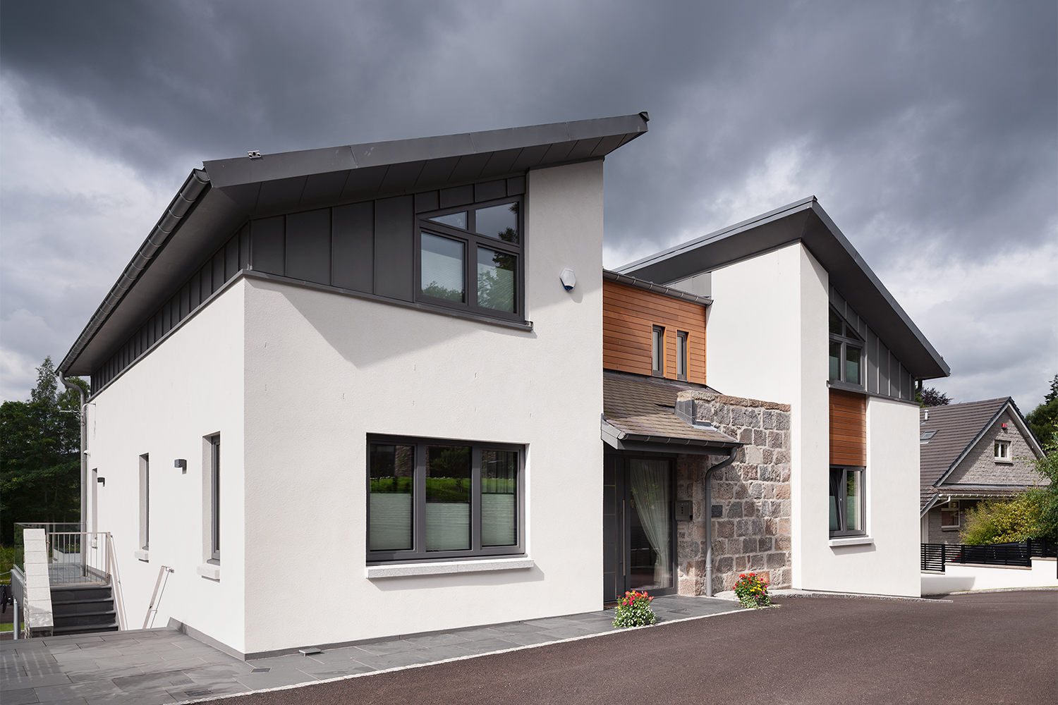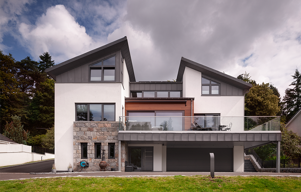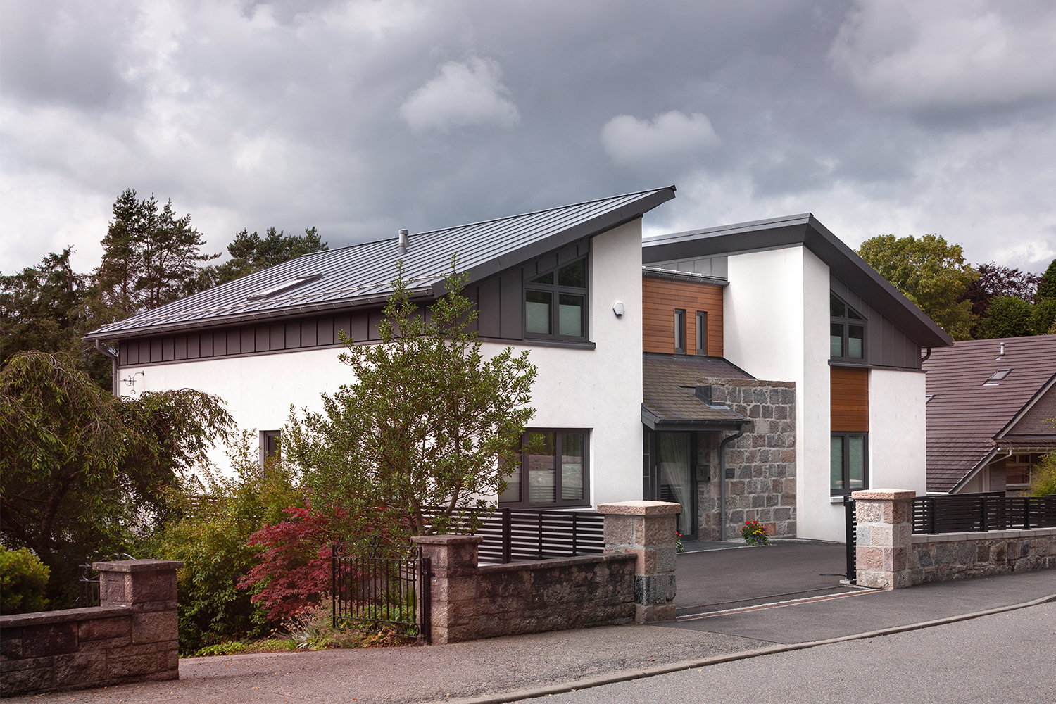 Huntershill is a replacement new build dwelling in Banchory, Royal Deeside. A single detached dwelling situated on a generous site with large garden grounds to the south of the property leading down to the old Banchory Railway Line.