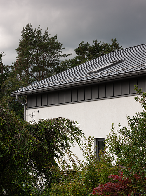 Huntershill is a bold contemporary replacement to the previous dwelling . The site slopes considerably down to the south from approach from the road and because of the site topography the building has a 2 & 3/4 elevation including the basement level. By dividing the form and building into the natural gradient the dwelling gradually sits down into the site complementing the expansive garden grounds.