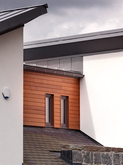 The choice of materials create a uniform natural colour palette whilst giving a contemporary feel to the building form. Materials are purposely broken up by change in either use or emphasising the specific element they are assigned to for example the granite front entrance in relation to the rear utility block wrapping round to the rear entrance or the timber cladding dividing the render to form distinctive break out areas.
