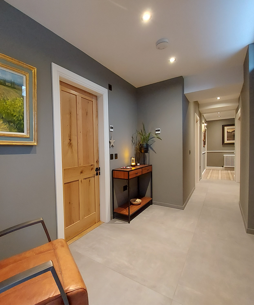 A simple linear extension to the rear of the house provided a new ground floor family bathroom, an entrance lobby, and an open plan family kitchen/living/dining space, providing access and westerly views across the private residential garden grounds.