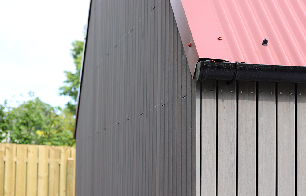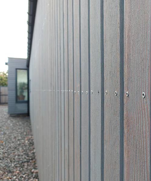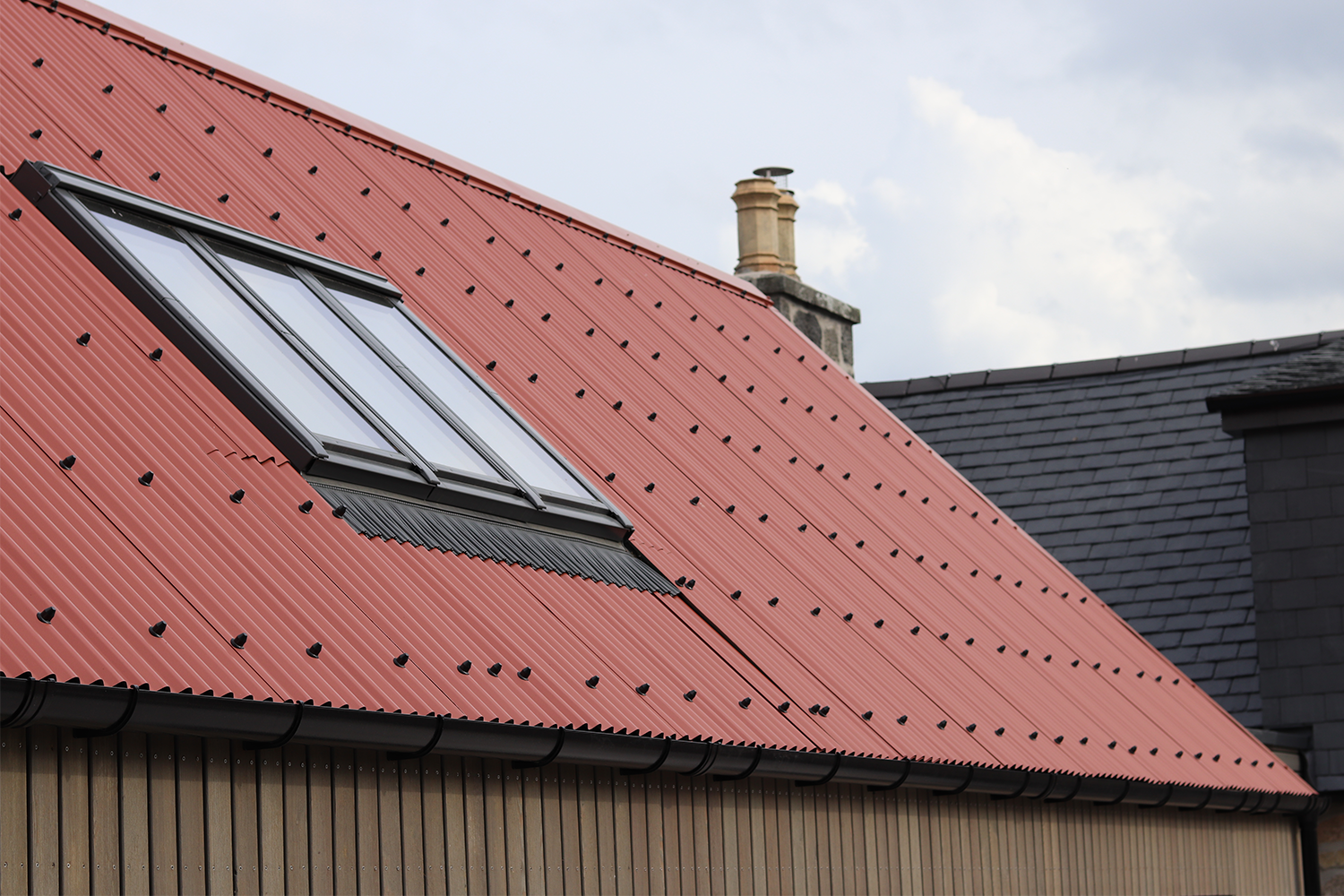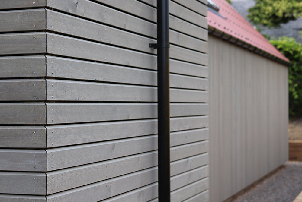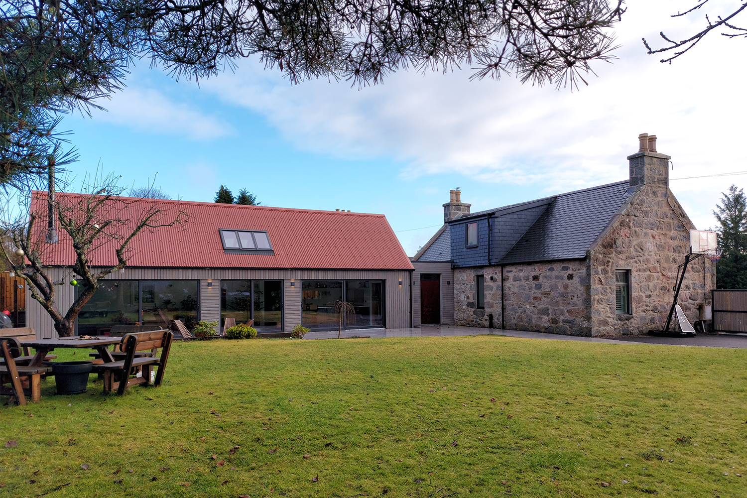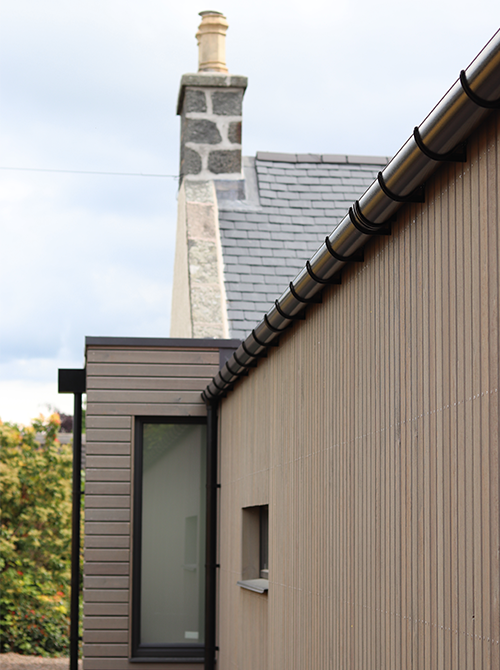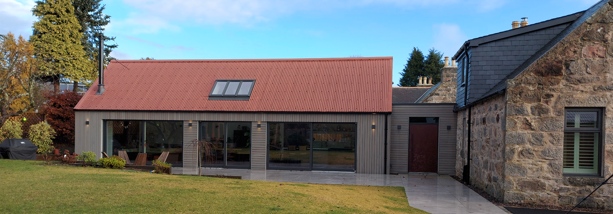 The extension has a Terracotta Corrugate Steel roof and clad in horizontal and Vertical Siberian Larch Cladding which has been vacuum coated to accelerate the natural silvering process. These materials contrast well with the existing original stone house. The combination of materials gives the house a contrasting and contemporary kerb appeal yet maintain a close relation to the familiar rural buildings seen in the north east of Scotland.